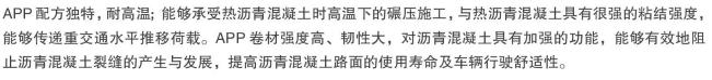 路橋?qū)S盟苄泽w(APP)瀝青防水卷材是以APP路橋?qū)S酶男詾r青為防水涂改物,經(jīng)輥壓密實,表面以聚乙烯膜、細砂、頁巖片等礦物粒料為隔離、保護覆蓋材料制成的耐高溫柔性防水材料。