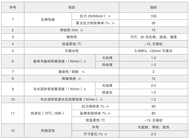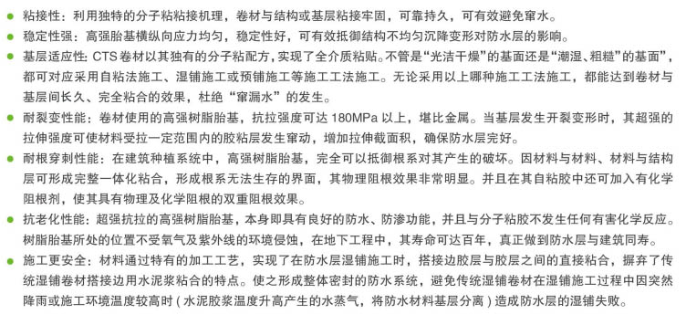 GTS高分子自粘防水卷材是以高強樹脂為胎基,與特殊的自粘膠料相復合而成,可與砂漿或混凝土基層實現(xiàn)分子級的完美貼合。該產品具有優(yōu)異的粘接性、穩(wěn)定性、耐裂變性、抗老化性能、極強的抗拉強度和抗基層縫變形能力,克服了傳統(tǒng)防水卷材的諸多不足。