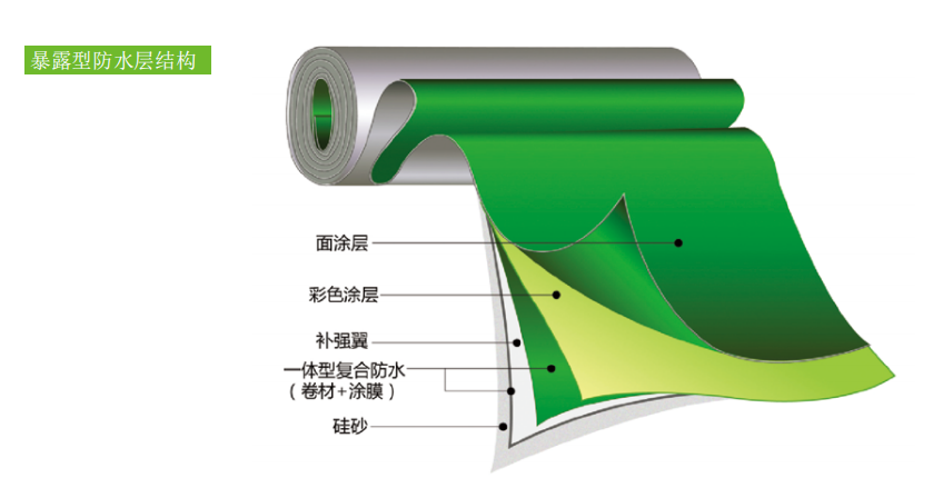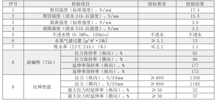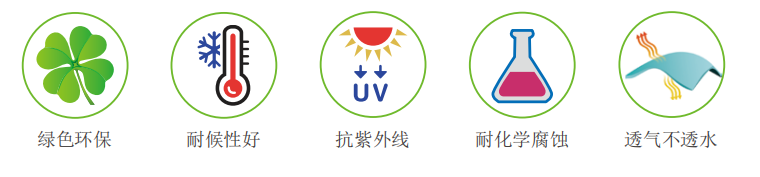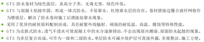 GTS防水卷材由高耐候防水涂料,增強胎體及雙層自粘橡膠瀝青膠料,多層材料復(fù)合而成,后背隔離膜。其中, 涂料防水層除可增強卷材的耐老化性能外,還具有防水的功能。尤其是在外露要求、耐久年限和防水等級 較高的建筑防水施工工程中,該系統(tǒng)能有效的解決現(xiàn)有防水卷材的環(huán)保以及耐久問題。產(chǎn)品通過引進技術(shù) 來優(yōu)化產(chǎn)品結(jié)構(gòu),高耐候涂層作為保護層,卷材搭接邊覆合自粘網(wǎng)格帶作為增強層。高耐候涂層使卷材耐 候性更優(yōu)異,直接外暴露,無需保護層,卷材搭接邊網(wǎng)格增強層,解決了防水卷材施工后搭接處易翹邊的問題。 GTS 復(fù)合防水卷材通過住房和城鄉(xiāng)建設(shè)部科技成果報告,此產(chǎn)品已入選北京市 2016 年節(jié)能低碳技術(shù)產(chǎn)品 及示范案例推薦目錄。 部分性能指標(biāo): GTS 防水卷材為綠色面層,系高分子類,無毒無害,綠色環(huán)保