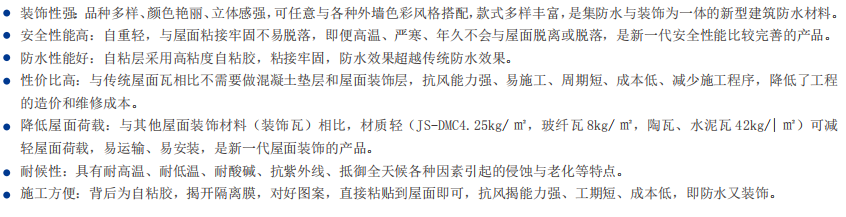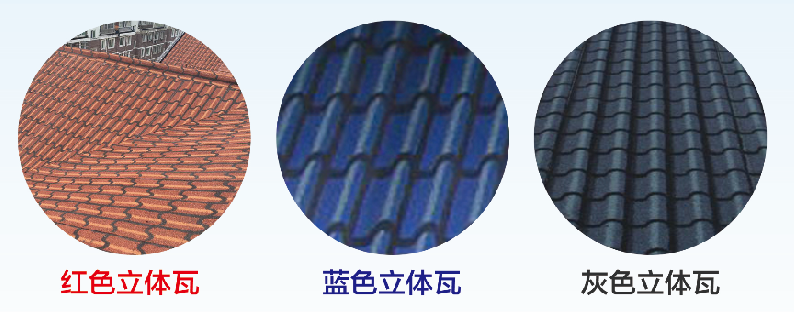 三維立體多彩屋面瓦簡(jiǎn)稱(chēng)(JS-DMC)是以玻璃纖維氈為胎基,表面涂蓋經(jīng)特殊工藝制作的優(yōu)質(zhì)氧化瀝青,上面噴灑保護(hù)裝飾多彩高溫?zé)Y(jié)瓷砂粒,下面撒以隔離材料并涂蓋自粘膠制成,它有著優(yōu)良的耐老化性能。 該產(chǎn)品款式多樣、立體感強(qiáng)、顏色豐富,自重輕安全系數(shù)高、防水效果好、裝飾效果強(qiáng)、施工方便、工程造價(jià)低,是新一代屋面裝飾的升級(jí)換代產(chǎn)品。